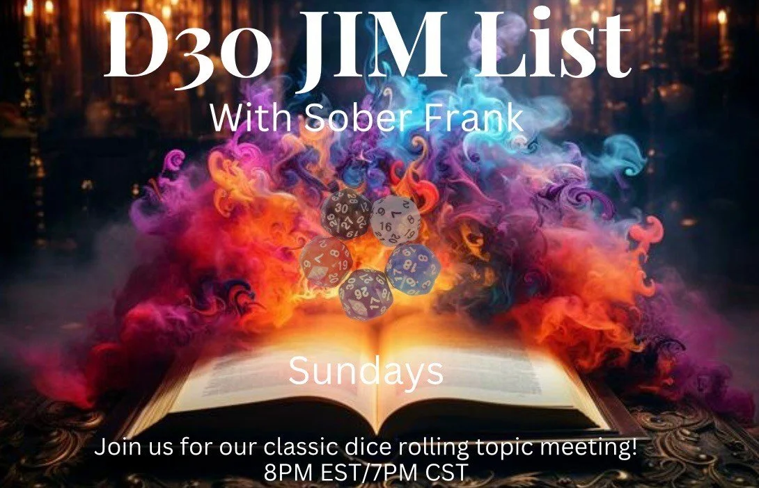 Sober Frank is rolling on the JIM list, and sometimes he will have special guests, speakers, whatever his wicked imagination comes up with. Join the discussion or listen.
